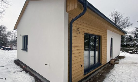 Dispozice domu je 2+kk na zastavěné ploše 49,7 m2.