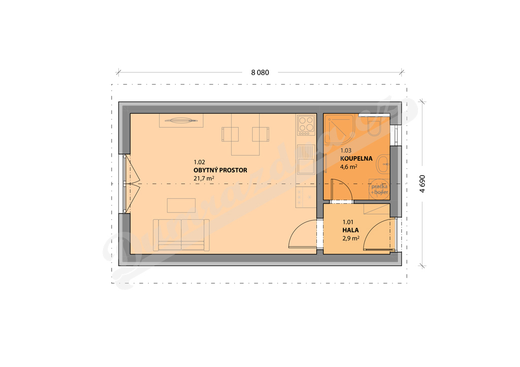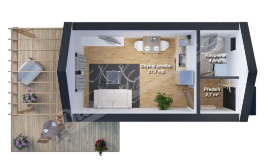 Poklud se nevejdete do Bungalovu 0, nemusíte si zoufat – máme pro vás o 8 metrů čtverečních větší variantu. Dispozice zůstává stejná, jen obytná místnost s kuchyní a koupelna nabízejí více prostoru. Pokud by vám to bylo pořád málo, doporučujeme doplnit minidům o typovou pergolu, která rozšíří užitný prostor na čerstvý vzduch.