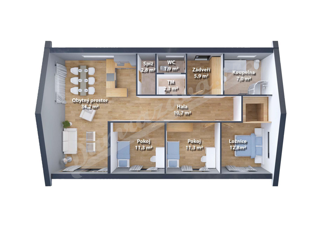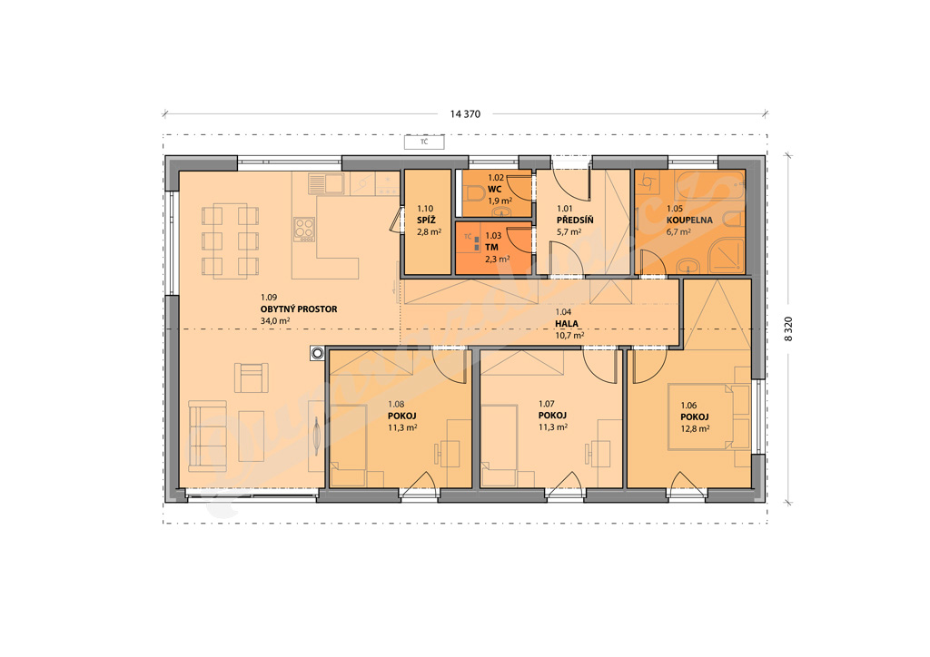 Zádveří, hala, obytný prostor s kuchyní a vstupem na terasu, 3 pokoje, koupelna, WC, technická místnost, sklad