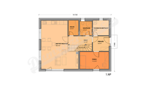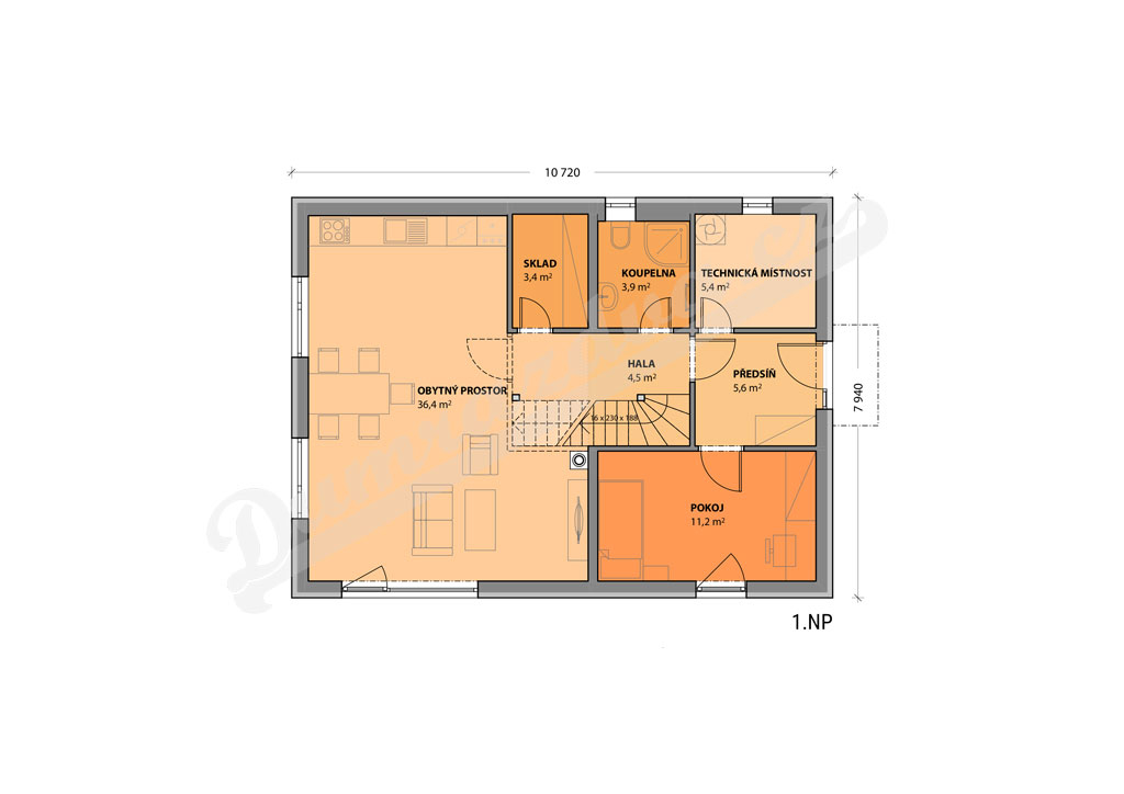 Přízemí – Vstupní hala, obytný prostor s kuchyní a se vstupem na terasu, pokoj, koupelna, sklad, technická místnost